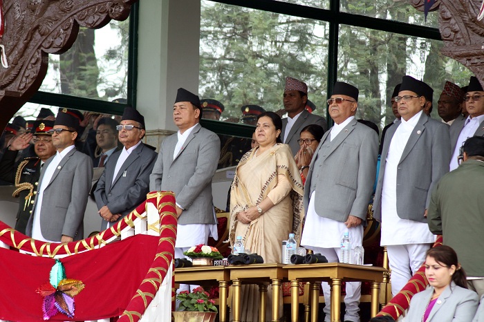 समारोहमा राष्ट्रपति, उपराष्ट्रपति, प्रधानमन्त्री, कामु प्रधानन्यायाधीश, सभामुख र राष्ट्रिय सभाका अध्यक्षले शान्तिका प्रतीक एक÷एक जोडी परेवा उडाउएका थिए । समारोहमा राष्ट्रपतिको सम्मानमा नेपाली सेनाको टुकडीले सलामी अर्पण गरेको थियो । गणतन्त्र दिवस मूल समारोह समितिका अध्यक्ष प्रधानमन्त्री केपी शर्मा ओलीले समारोहलाई सम्बोधन गरेका थिए ।
