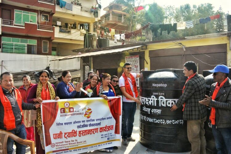 काठमाडौं । महालक्ष्मी विकास बैंक लिमिटेडको गोंगबु शाखाले संस्थागत सामाजिक उत्तरदायित्व कार्यक्रमअन्तर्गत टोखा नगरपालिकाको वडा नं ११ मा रहेको सार्वजनिक शौचालयलाई २ हजार लिटरको २ वटा पानीट्यांकी प्रदान गरेको छ ।