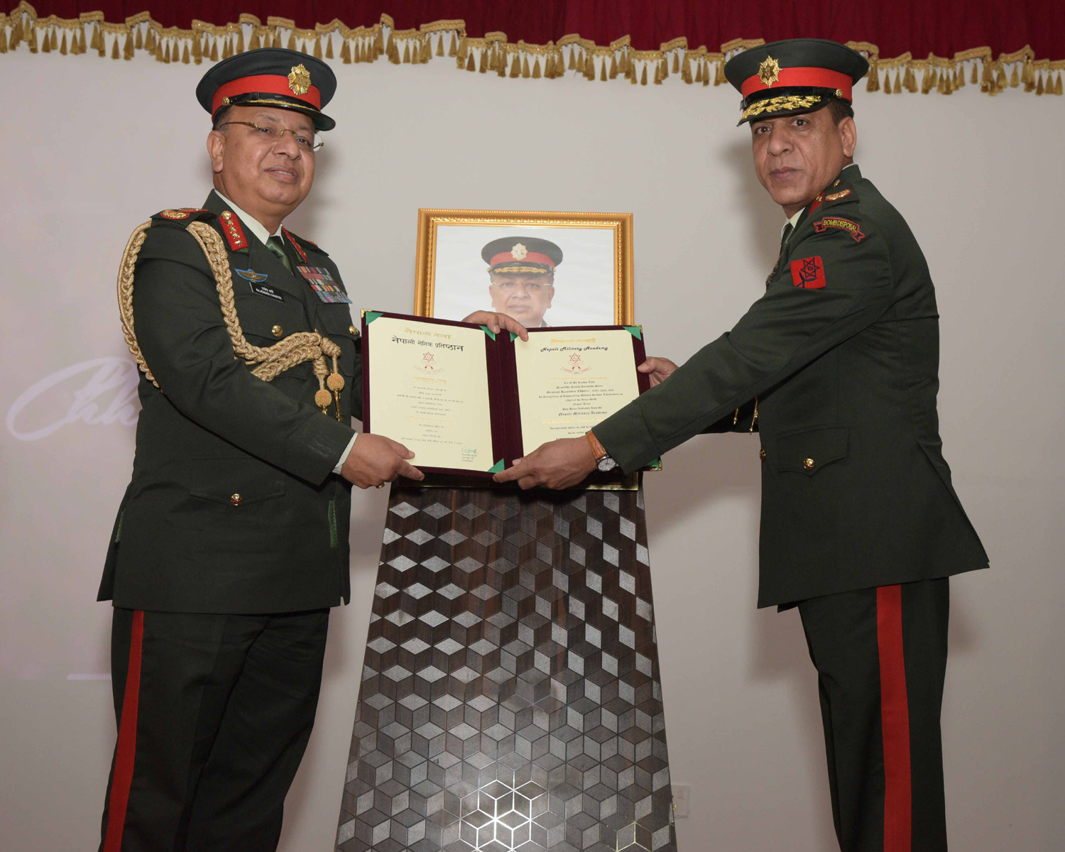 सैनिक प्रतिष्ठानमा बुधवार आयोजित विशेष कार्यक्रममा प्रधानसेनापति क्षत्रीलाई प्रतिष्ठानका शिक्षाधिकृत सहायकरथी सीताराम खड्काले सम्मान पत्र प्रदान गरेका हुन ।