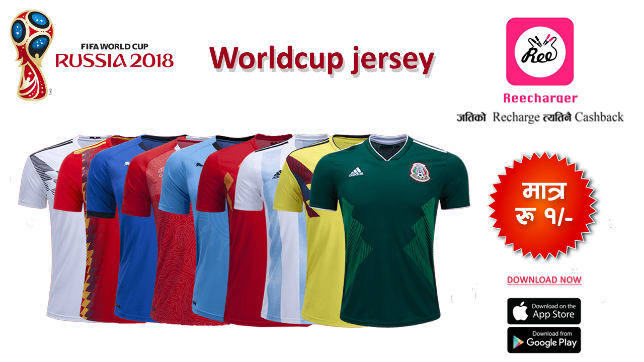 काठमाडौं । विश्वकप फुटलको रौनक छाउँदै गर्दा तपाई आफुलाई मन पर्ने देशको जर्सी किन्ने सोचमा हुनुहुन्छ भने मोबाइल PkReecharger ले १ रुपैंयामा त्यस्तो जर्सी उपलब्ध गराउने भएको छ । आफ्नो ब्राण्ड प्रवद्र्धनका साथै नेपाली फुटबल प्रेमिलाई ९९९ रुपैंयाको जर्सी १ रुपैंयामा उपलब्ध गराउने अफर Reecharger ले ल्याएको हो ।