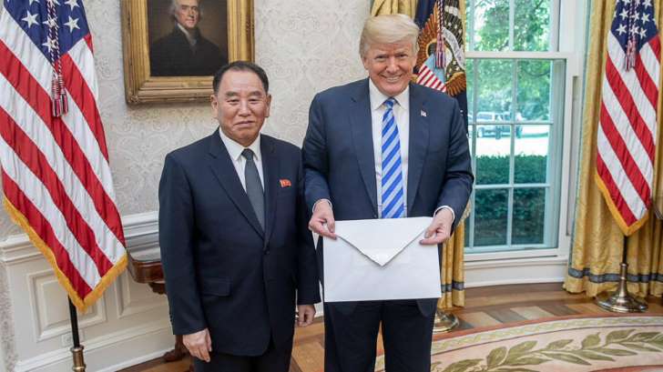 फोटोमा उनका दाँया हात मानिएका गुप्तचर संस्थाका पूर्व प्रमुख किम जोङ चोलसँग ट्रम्पले पत्र लिएको देखिन्छ ।
