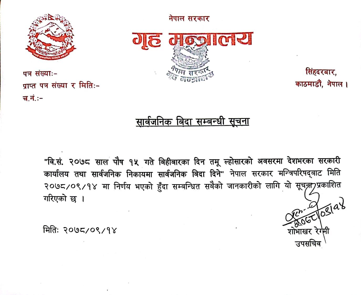 आजको मन्त्रिपरिषद्को बैठकले तमु ल्होसारमा सार्वजनिक बिदा दिने निर्णय गरेको मन्त्रालयका उपसचिव शोभाखर रेग्मीद्वारा जारी विज्ञप्तिमा उल्लेख छ ।