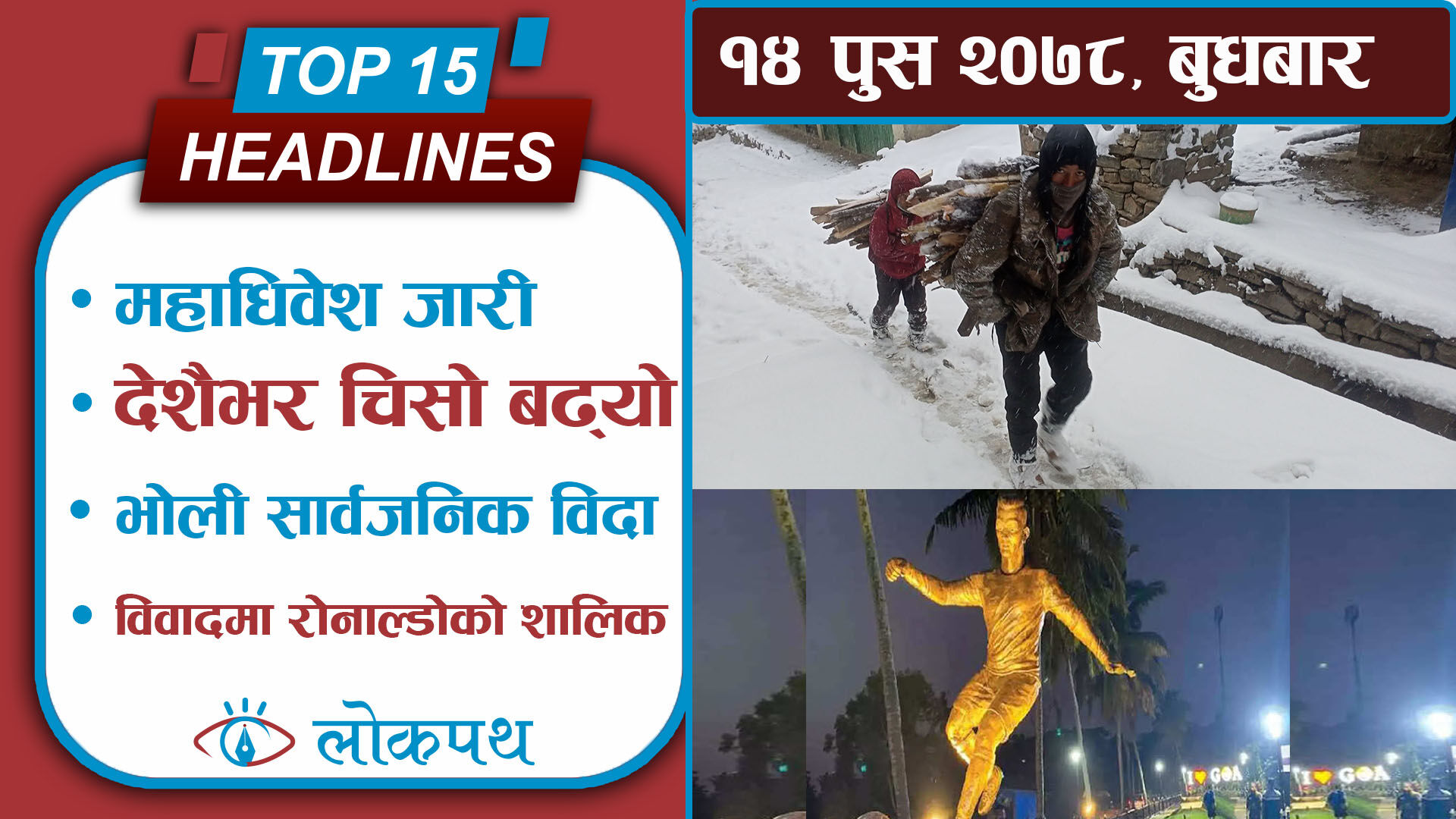 ६. बुधबार काठमाडौं उपत्यकासहित देशैभर वर्षा, वर्षा र हिमपातका कारण मुलुकभर चिसो बढ्यो, जनजीवन कष्टकर ।