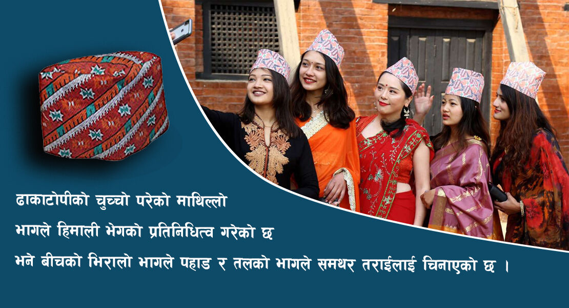 अर्काे कुरा टोपीको बनोटले नै हिमाल पहाड र तराईको प्रतिनिधित्व गर्ने संस्कृतविदहरुले बताउँदै आएका छन् । टोपीलाई आत्मसम्मान र समर्पणको प्रतिकका रुपमा लिइन्छ । नेपाली टोपीले नेपालीको शिर मात्र ढाकेको छैन जसले समग्र नेपालको शिर उच्च बनाउँदै आएको छ ।