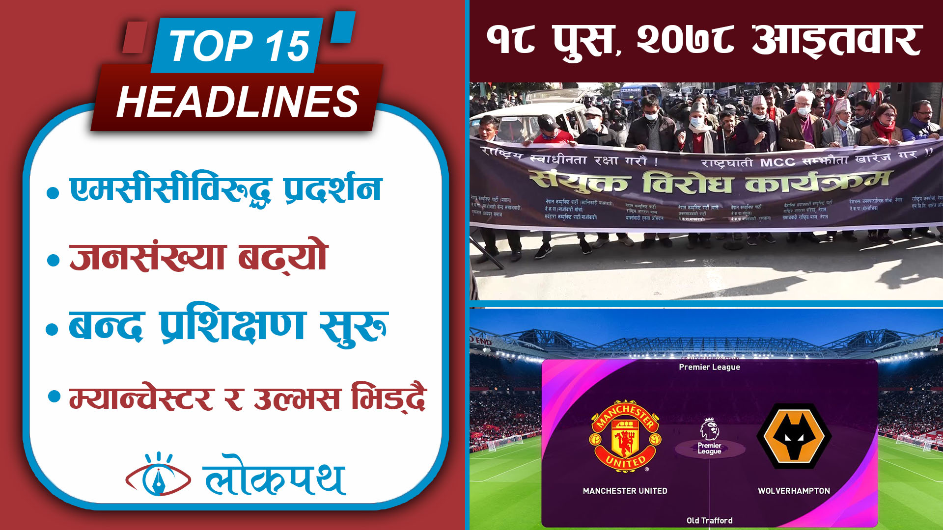 १५. र, इंग्लिस प्रिमियर लिग फुटबलअन्तर्गतको खेलमा आज राति म्यानचेस्टर युनाइटेड र उल्स भिड्दै, दुवै टिम एक–अर्कालाई हराएर जित हात पार्ने दाउमा ।