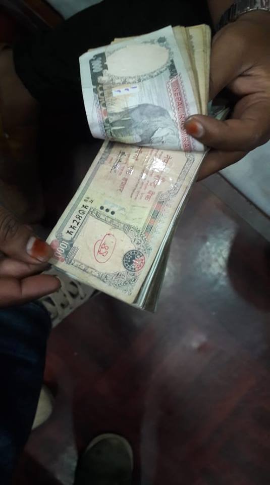 नगद गन्ने क्रममा एउटा हजारको नोटमा सेतो स्टिकर टाँसेको देखापरेपछि खोतलेर हेर्दा अन्य हजार–हजारको सद्दे नोटसंगै बीच–बीचमा अर्को च्यातिएको नोटको अर्ध कट्टी टाँसेको अवस्थामा फेला परेको थियो ।