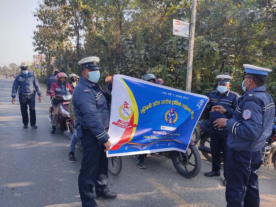 लुम्बिनी प्रदेश ट्राफिक प्रहरी कार्यालयको पहलमा र जिल्ला ट्राफिक प्रहरी कार्यालयको समन्वयमा लुम्बिनी प्रदेश स्तरीय सचेतना कार्यक्रम अन्तर्गत चालकसँग ट्राफिक प्रहरी अभियान विगत एक महिनादेखि संचालनमा छ । महिनाको चार साता फरक फरक कार्यक्रम भइरहेको छ । जसअन्तर्गत पहिलो साता मोटरसाइकल, दोस्रो साता हलुका सवारीसाधन तेस्रो साता ठूला सवारीसाधन र चौथो साता साइकल, रिक्सालगायतका सवारी साधनहरूलाई दुर्घटनाबाट बच्ने उपाय, सडक प्रयोग गर्दा अपनाउनु पर्ने सावधानी, ओभरटेक कसरी गर्ने भनेर सिकाउने, लेनसम्बन्धी प्रशिक्षण भइरहेको प्रमुख केसीले बताए ।