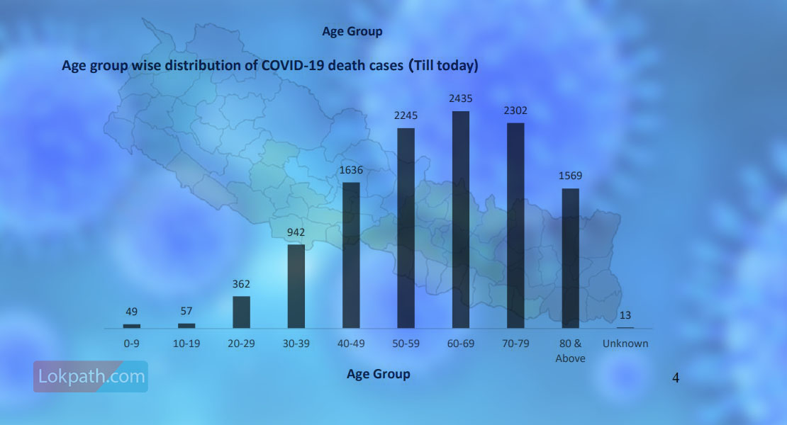 स्वास्थ्य मन्त्रालयको तथ्यांकअनुसार ६० देखि ६९ वर्ष उमेरसमूहका २४ सय ३५ जनाले काेराेनाका कारण ज्यान गुमाएका छन् ।