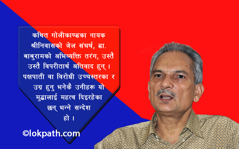 कथित गोलीकाण्डका नायक श्रीनिवासको जेल संघर्ष, डा. बाबुरामको अभिव्यक्ति तरंग, उस्तै उस्तै विपरीतार्थ अतिवाद हुन् । पक्षपाती वा विरोधी उच्चस्तरका र उग्र हुनु भनेकै उनीरू यो मुद्धालाई महत्व दिइरहेका छन् भन्ने सन्देश हो ।