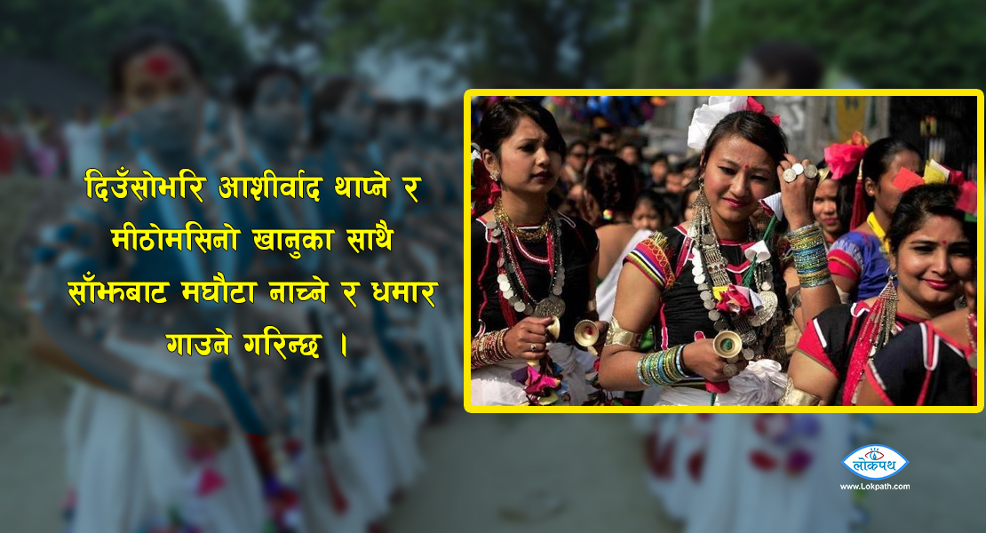 थारु समुदायले माघ १ गते खानपिन, ढोगभेट र रमाइलोमै बिताउने गरेको छ । दिउँसोभरि आशीर्वाद थाप्ने र मीठोमसिनो खानुका साथै साँझबाट मघौटा नाच्ने र धमार गाउने गरिन्छ ।