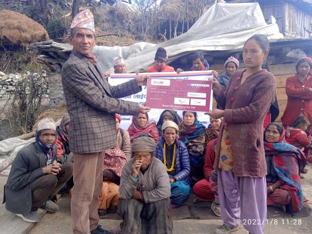 एसियन लाइफ इन्सोरेन्यान्स कम्पनी उप शाखा मुगुमा वार्षिक अग्रिम भुक्तानी प्याकेजमा बिमा गराएका छायानाथ रारा नगरपालिका-८ टोप्लाका २५ वर्षका टोपबहादुर विष्ट गत २६ असोजमा पिना बस दुर्घटनामा परी मृत्यु भएपछि मृतकको मृत्यु दावी रकम उनकी श्रीमतीलाई दुई लाख २० हजार २०० रकम हस्तान्तरण गरिएको एसियन लाइफ इन्स्योरेयान्स मुगुले जनाएको छ ।