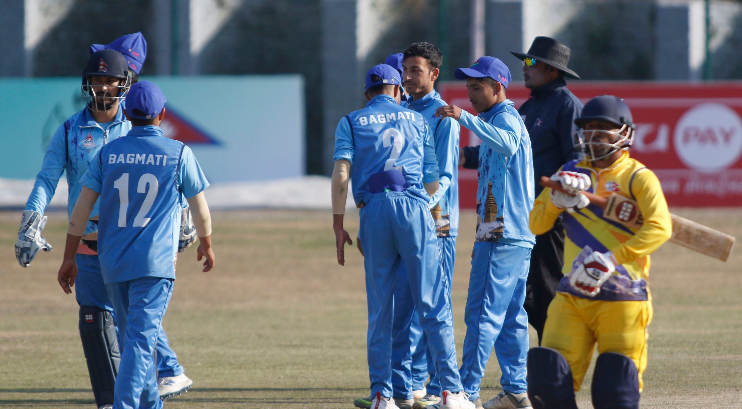 बागमतीका नन्दन यादव र रिजन ढकालले समान दुई-दुई विकेट लिँदा प्रतिस जिसीले एक विकेट लिए । दोस्रो सेमिफाइनलमा एपीएफ र आर्मी भिड्नेछन् ।