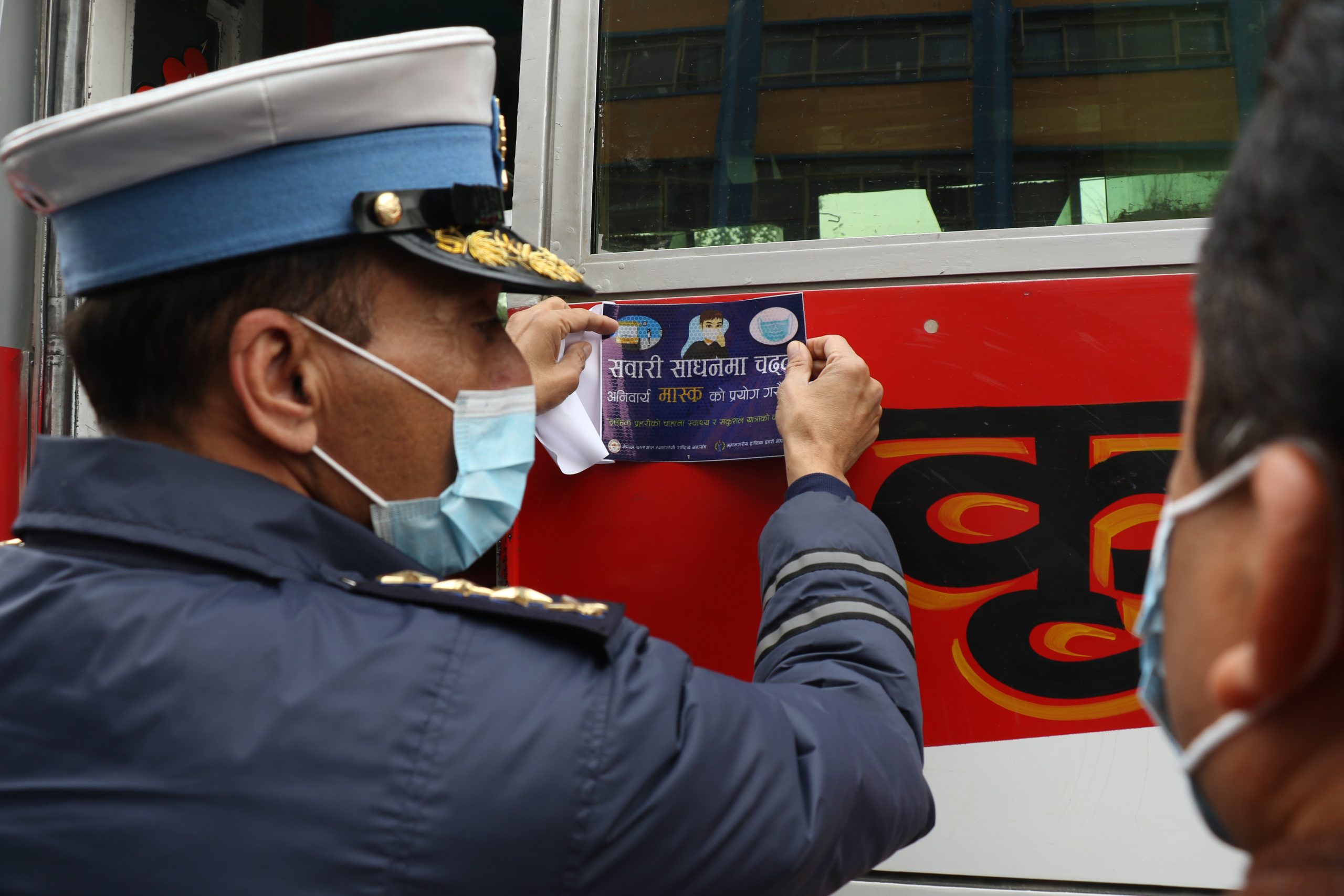 ट्राफिक प्रहरीले सार्वजनिक सवारी साधनका चालक सह(चालक तथा यात्रुवर्गहरुलाई अनिवार्य मास्कको प्रयोग गर्न अनुरोध गर्दै सवारी साधनहरुमा सुचनामुलक स्टिकर टाँस गरेको छ ।