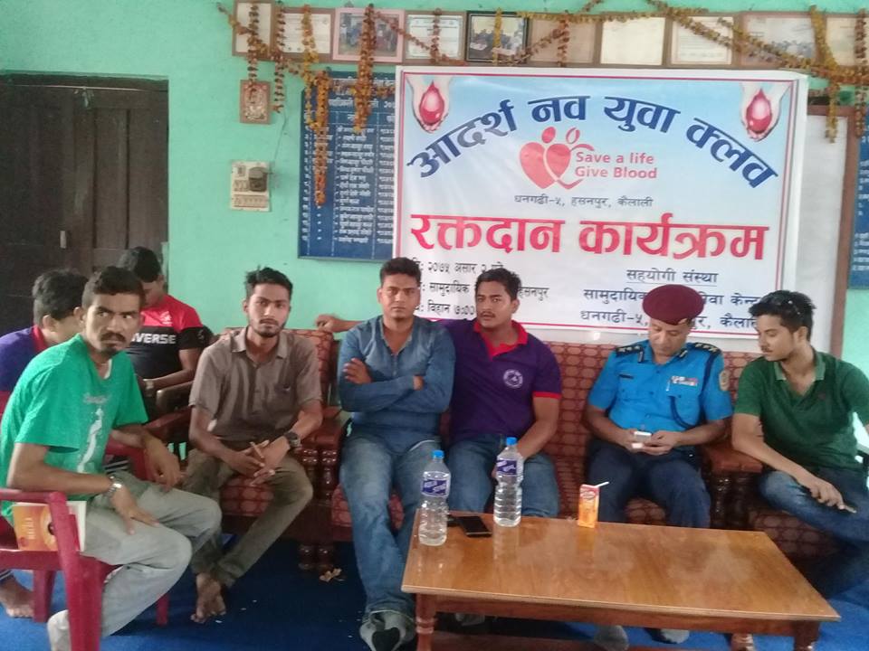 शनिबार धनगढी उपमहानगरपालिका–५, हसनपुरस्थित सामुदायिक प्रहरी सेवा केन्द्र र आदर्श नव यूवा क्लवको संयुक्त आयोजनामा बृहत रक्तदान कार्यक्रमको आयोजना गरिएको हो ।
