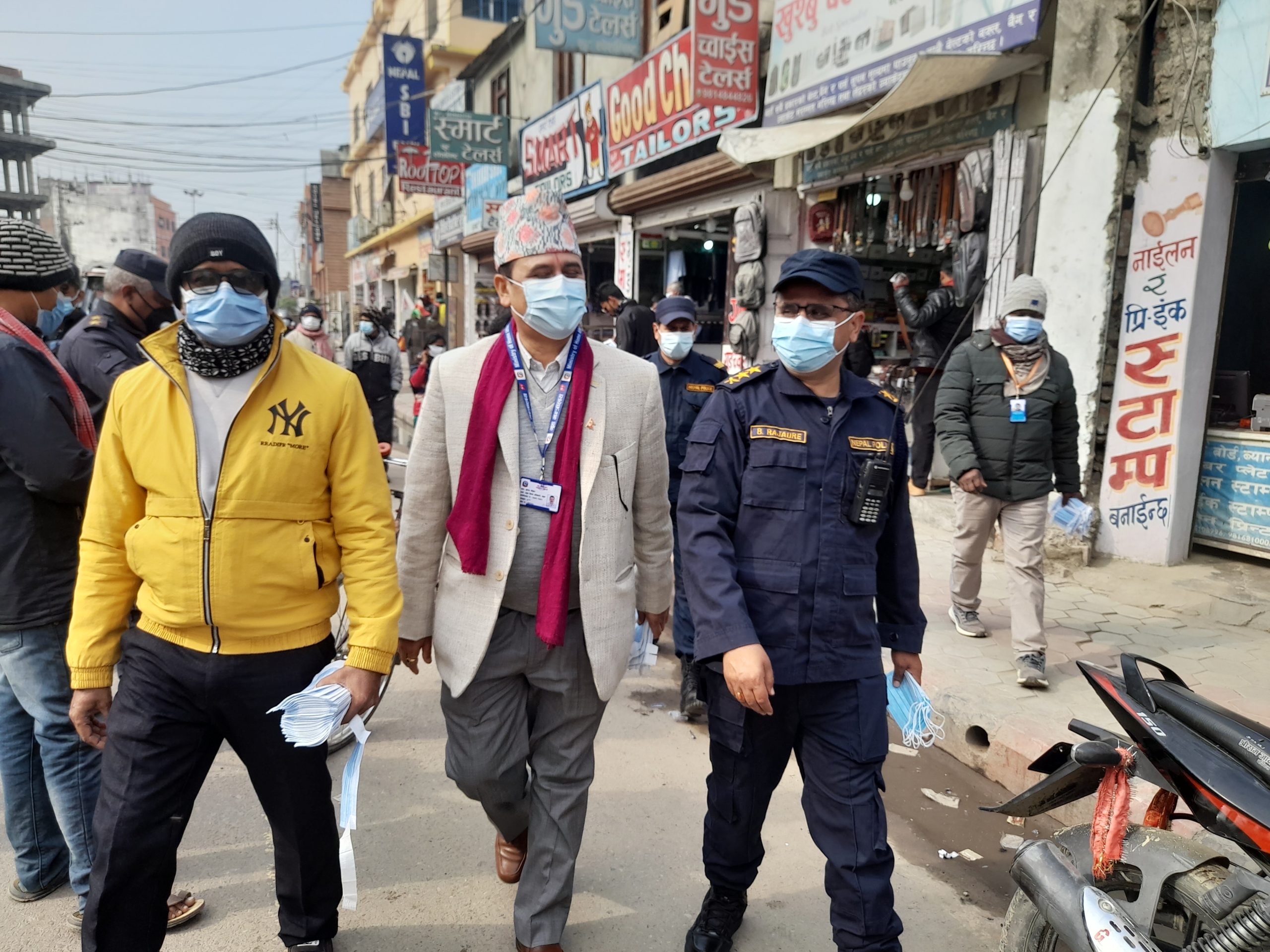 प्रमुख जिल्ला अधिकार पौडेल, उपरीक्षक रजौरेसहितले बजारमा घुमिघुमी मास्क नलाएकाहरूलाई मास्क उपलब्ध गराउन आग्रह गरेका थिए ।