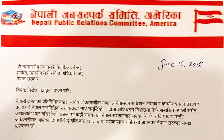 नेपाली जनसम्पर्क समिति अमेरिकाका वरिष्ठ उपसभापति धनन्जय नरसिंह केसीको नेतृत्वमा बुझाइएको ज्ञापन पत्रमा संविधान प्रदत्त गैरआवसीय नेपालीहरूको अधिकारका सम्बन्धमा नेपाल सरकारका जिम्मेवार मन्त्रीबाटै गैरजिम्मेवार अभिव्यक्ति आएको भन्दै गभ्भीर ध्यान आकर्षण गराइएको छ ।