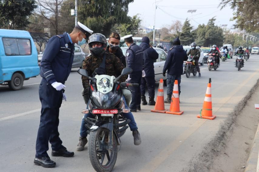 अत्यावश्यकीय क्षेत्रबाहेकका सवारीसाधनमा गरिएको जोर बिजोर कार्यान्यवनका लागि ट्राफिक प्रहरीले परिचयपत्र हेर्दै चेकिङ गरेका छन् ।