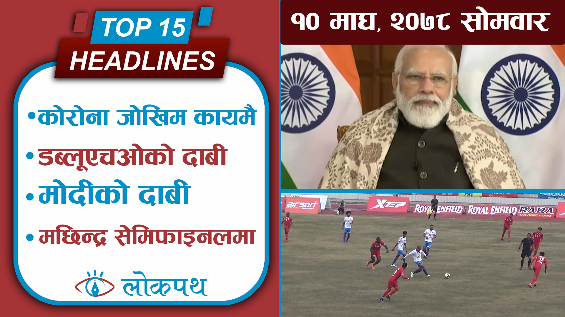१५. र, पोखरामा जारी २०औँ संस्करणको ‘आहा रारा गोल्डकप’ फुटबल प्रतियोगितामा मछिन्द्र क्लब पहिलो पटक सेमिफाइनलमा प्रवेश, साबिक विजेता संकटा क्वाटरफाइनलबाटै बाहिरियो ।