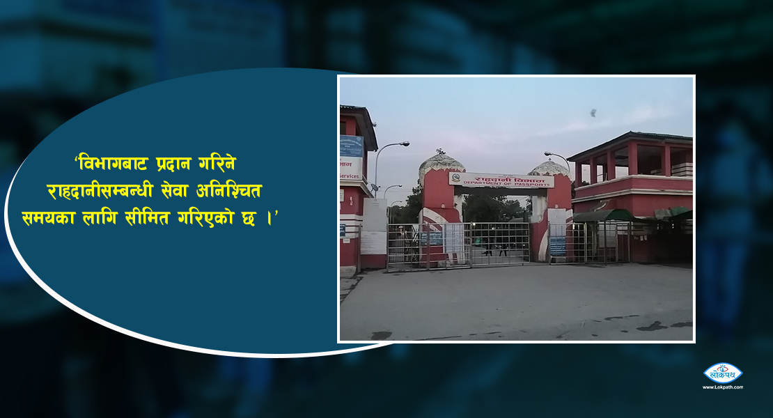 कोभिड १९ सम्बन्धी नेपाल सरकारको मिति २०७८/९/३० को निर्णय तथा विभागका कर्मचारीहरूमा व्यापकरूपमा फैलिएको कोरोना भाइरसको कारण विदेशमा उपचार गर्न जानेजस्ता गम्भीर प्रकृतिका अत्यावश्यक सेवाबाहेक विभागबाट प्रदान गरिने राहदानी सेवासम्बन्धी सेवा अनिश्चित समयका लागि सीमित गरिएको छ ।