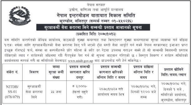 नेपाल इन्टरमोडल यातायात विकास समितिले काठमाडौं र विराटनगर सुक्खाबन्दगाह सुरक्षा व्यवस्थाका लागि सुरक्षाकर्मीको सेवा करारमा माग गरेको छ ।