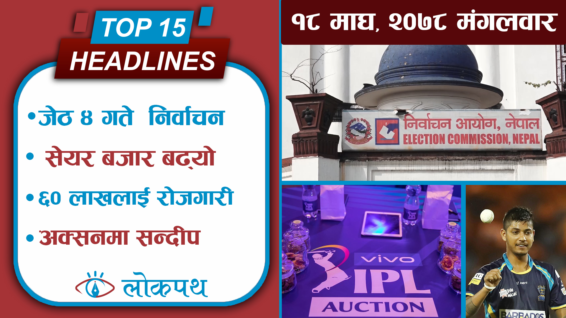 १५. र १५औ संस्करणको इन्डियन प्रिमियर लिग (आईपीएल) अक्सनमा नेपालबाट सन्दीप लामिछाने मात्रै, अक्सनबाट लामिछानेलाई भित्र्याउन चाहने टिमले ६४ लाख रुपैयाँ तिर्नुपर्ने।