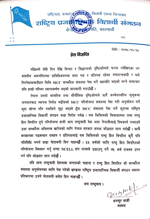 विवादस्पद एवं राष्ट्रहित विपरीत एमसिसी संझौता अविलम्ब खारेज गर्न पनि राप्रविसंले सरकारसँग माग गरेको छ । राष्ट्रहित विपरीत कुनै पनि गतिविधि नगर्न सरकारमा सामेल गठबन्धनका दलहरु र प्रतिपक्षहरुलाई राप्रपा निकट विधार्थी संगठनले चेतावनी दिएको छ ।