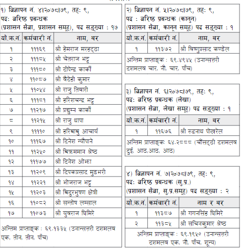 कार्यसम्पादन मूल्यांकन, जेष्ठता, भौगोलिक क्षेत्र र शैक्षिक योग्यता अनुसार प्रशासनतर्फ १७, सुप्रतर्फ २ र कानुन-लेखामा १/१ जनालाई बढुवा सिफारिस गरेको हो ।