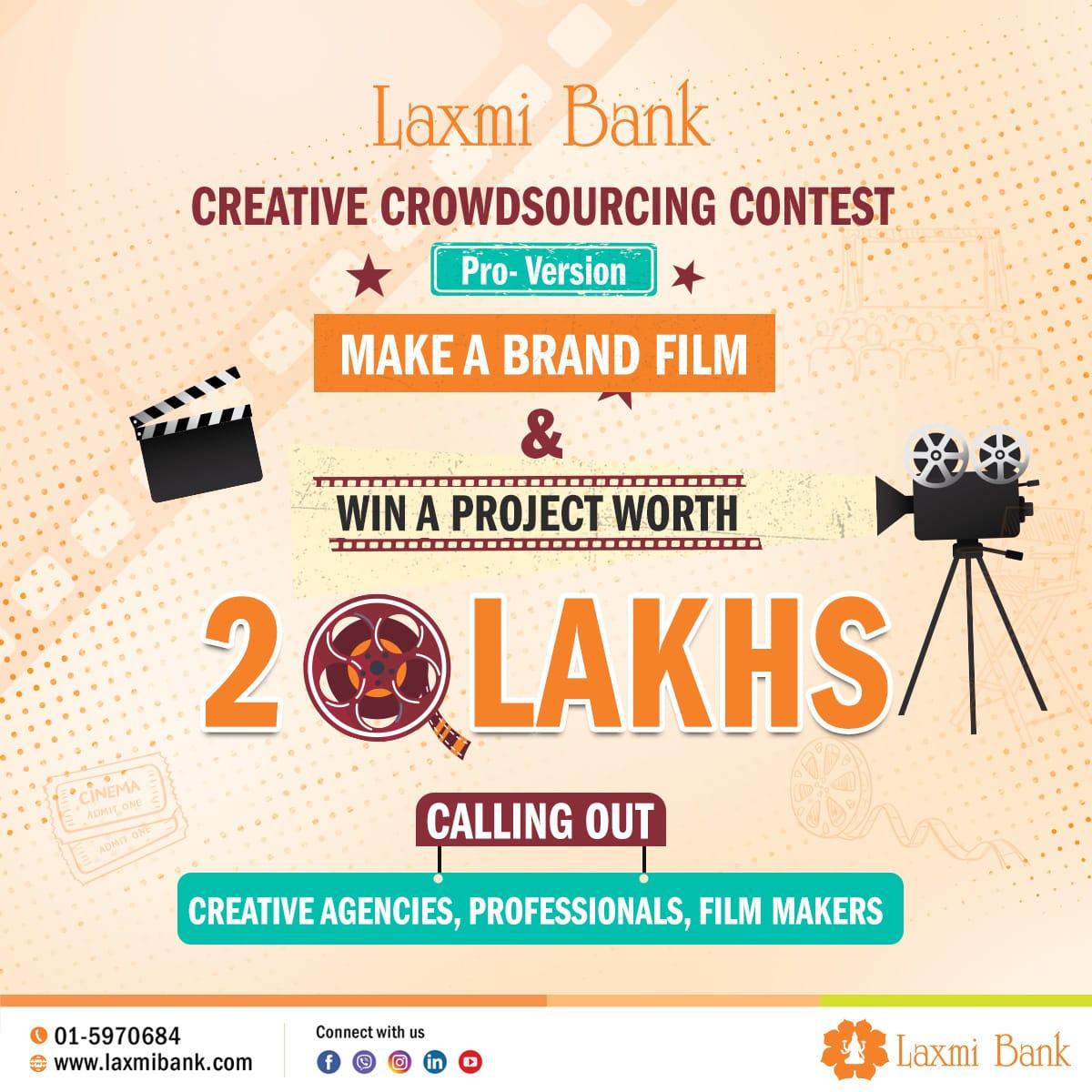 यस विषयमा थप जानकारीका लागि यहाँ क्लिक गर्नुहोस्: https://www.laxmibank.com/brand-film-contest/ सो प्रतियोगिता लक्ष्मी बैंकको Crowdsouring मा आधारित तेस्रो प्रतियोगिता हो ।