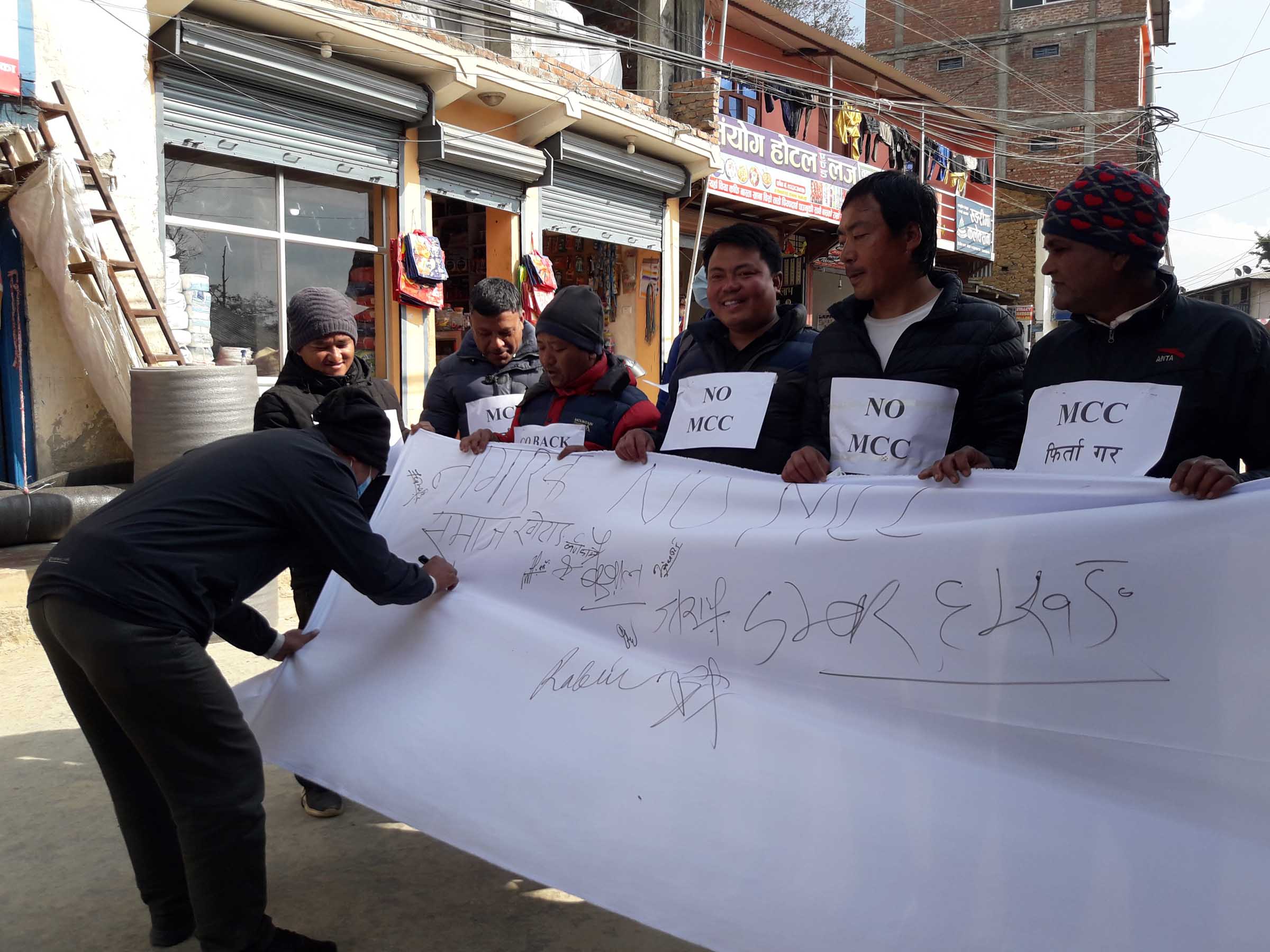 ‘नो एमसीसी, गो व्याक एमसीसी, रेजेक्ट एमसीसी, एमसीसी फिर्ता गर’लगायतका नारा लेखिएको प्लेकार्ड छातीमा टाँसेर एमसीसी सम्झौताविरुद्ध हस्ताक्षर संकलन सुरु गरिएको हो ।