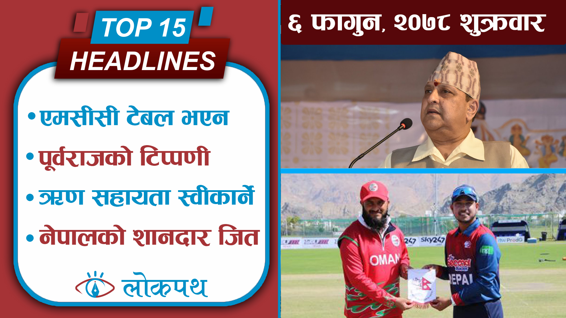 १५. र, आईसीसी पुरुष टी–२० विश्वकप ग्लोबल छनोटअन्तर्गतको पहिलो खेलमा नेपालको शानदार जित, घरेलु टोली ओमान ३९ रनले पराजित ।