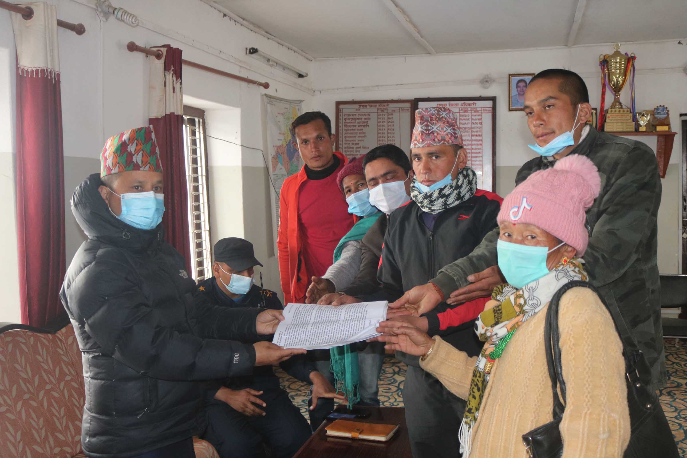 एमालेबाट निर्वाचित वडाध्यक्ष लिलाकुमार चौहान नेतृत्वको टोलीले मंगलबार नारावाजी गर्दै जिल्ला प्रशासन कार्यालयमा ज्ञापन-पत्र बुझाउँदै अवरुद्ध योजना सुचारु गर्नरगराउन माग राखेका छन् ।