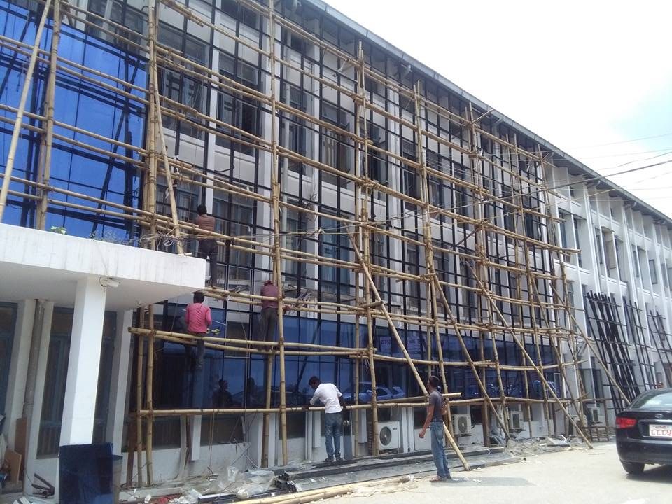 तीन तले यस भवनको अगाडि भागमा ‘मिरर पर्दा’ (आल्मुनियमा जडित सिसाको झ्यालहरु राखिदै छ ।