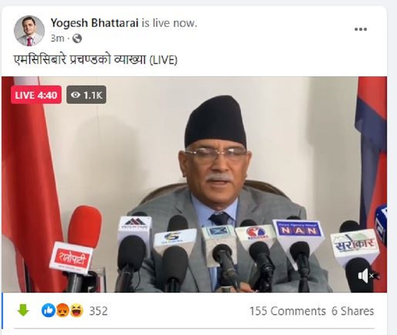 प्रचण्डले पत्रकार सम्मेलन गरिरहँदा उनको कट्टर आलोचक समेत रहेका प्रतिपक्षी दल नेकपा एमालेका सचिव योगेश भट्टराईको आधिकारिक फेसबुक पेजबाट उक्त लाइभ प्रशारण भएको देखियो । सामाजिक सञ्जाल प्रयोगकर्ताहरुले त्यसमा विभिन्न कमेन्ट तथा रियाक्टहरु गरेका थिए । तर अहिले भने नेता भट्टराईको उक्त लाइभ पेजबाट हटाएका छन् । तत्कालिन नेपाल कम्युनिष्ट पार्टी (नेकपा) को पार्टी एकता भंग भएपछि एमाले माओवादीका नेताहरु एक अर्कामा कटु आलोचनामा उत्रिरहेका छन् । पार्टी एकता भंग भएपछि एकै कार्यक्रममा समेत देखिन नचाहने एमाले माओवादी नेताहरुबीचको वाकयुद्ध चलिरहँदा भट्टराईको फेसबुकबाट लाईभ सेयर गल्तीले भएको बुझ्न सकिन्छ ।