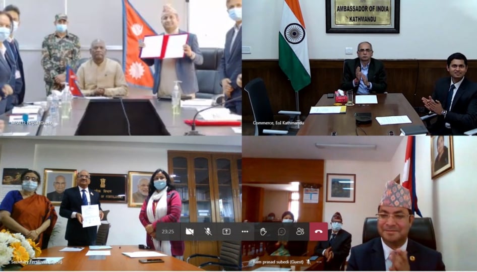 जीटूजी व्यस्थामार्फत भारतबाट नेपालतर्फ युरिया र डिएपी मलको दिर्घकालीन आपूर्तिका लागि भारत र नेपालबीच आज एक समझदारी पत्रमा हस्ताक्षर भएको हाे।