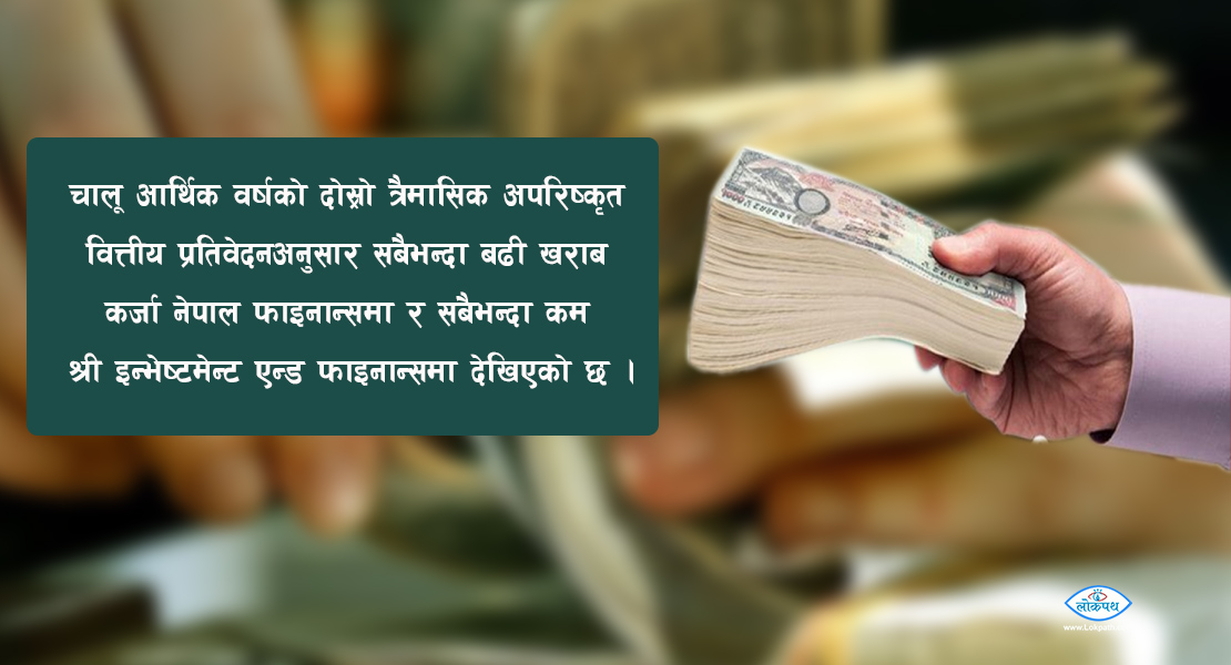 चालू आवको दोस्रो त्रैमासमा नेपाल फाइनान्समा १९ दशमलव शून्य तीन प्रतिशत कर्जा खराब देखिँदा श्री इन्भेष्टमेन्टमा शून्य दशमलव ८५ प्रतिशत कर्जा खराब देखिएको छ । गत आवको सोही अवधिमा यी फाइनान्सहरूमा यस्तो कर्जाको अनुपात क्रमशः ४१ दशमलव शून्य सात र शून्य दशमलव ७० प्रतिशत रहेको थियो ।
