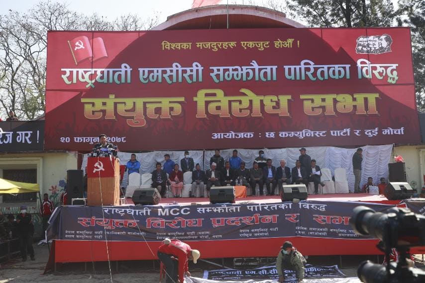विभिन्न ६ कम्युनिष्ट पार्टी र दुई मोर्चाले एमसीसीविरुद्ध शुक्रबार काठमाडौंमा आयोजना गरेको विरोधसभालाई सम्बोधन गर्दै विप्लवले राष्ट्रहितविपरीतको देश र जनताको भावना बेचेर सदनबाट एमसीसी सम्झौता अनुमोदन गरेर १५ फागुन कालो दिनको रुपमा दर्ज भएको बताएका हुन् ।