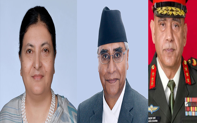 काठमाडौं । प्रधानमन्त्री शेरबहादुर देउवा र प्रधानसेनापति प्रभुराम शर्माले राष्ट्रपति विद्यादेवी भण्डारीसमक्ष आ–आफ्नोतर्फबाट प्रतिवेदन बुझाएका छन् ।