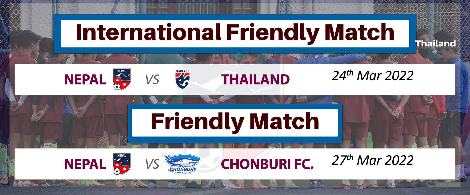 नेपालले थाइल्यान्डसँग २४ मार्चमा खेल्ने छ । यस्तै नेपालले थाइल्यान्डको क्लब चोनबरी एफसीसँग दोस्रो खेल खेल्ने छ । खेल २७ मार्चमा हुनेछ ।