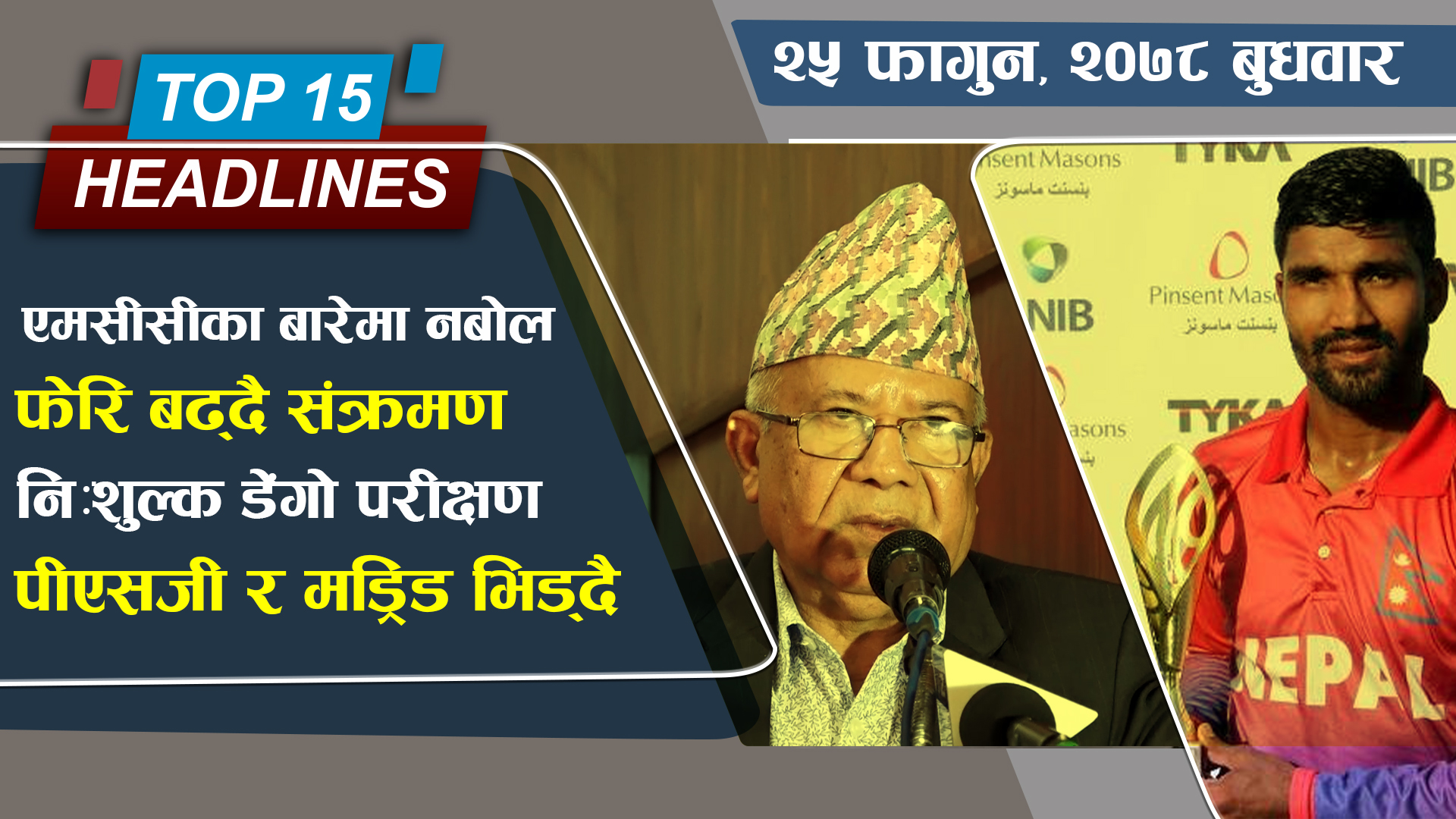 १५. र, यूईएफए च्याम्पियन्स लिगको क्वाटरफाइनल प्रवेशका लागि आज रियल मड्रिड र पीएसजी भिड्दै, अन्तिम ८ मा पर्नको लागि पीएसजीलाई बराबरी खेले पुग्ने ।