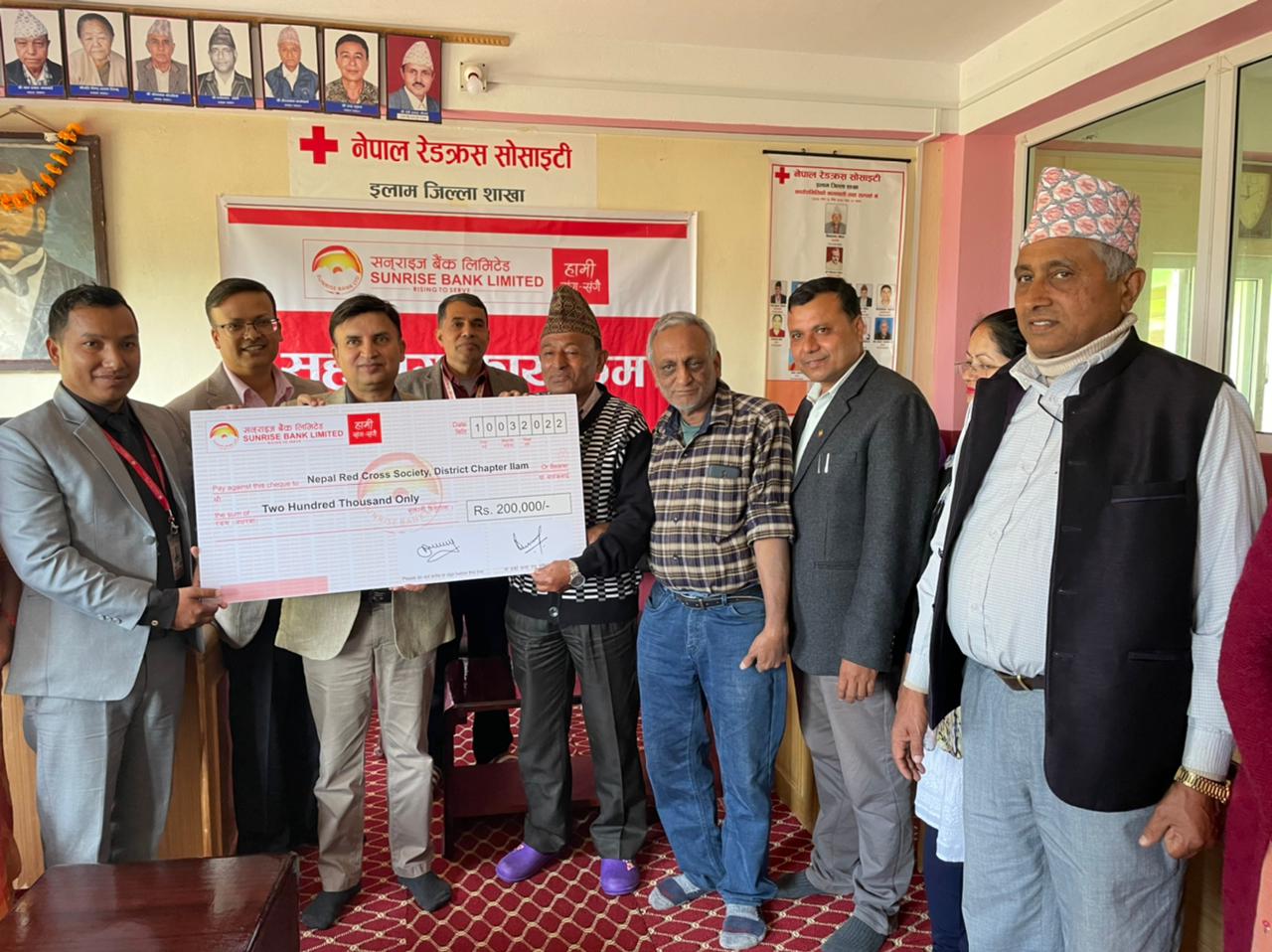 शनिबार एक कार्यक्रमकाबीच सनराइज बैंकका नायब महाप्रबन्धक रविन कुमार नेपालले, नेपाल रेडक्रस सोसाइटी ईलाम जिल्ला शाखाका सभापति शिव प्रसाद गौतमलाई दुई लाखको चेक हस्तान्तरण गरेका हुन् । रकम हस्तारण कार्यक्रममा सनराइज बैंकका प्रदेश नं १ का प्रमुख विवेक निरौला, इलाम शाखाका प्रमुख श्री ज्ञान श्याम गुरुङ्ग र बैंकका अन्य कर्मचारीहरुको उपस्थिति रहेको थियो ।