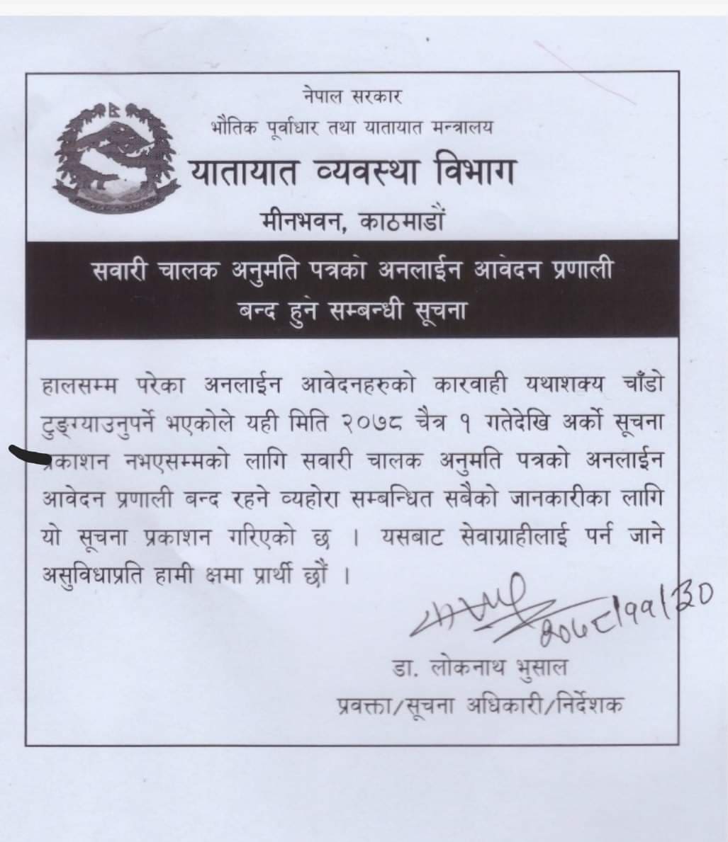 हालसम्म परेका अनलाइन आवेदनहरुको कारबाही यथाशक्य चाँडो टुंग्याउनुपर्ने भएकाले अनलाइन आवेदन प्रणाली बन्द गर्ने निर्णय गरेको विभागको भनाइ छ ।