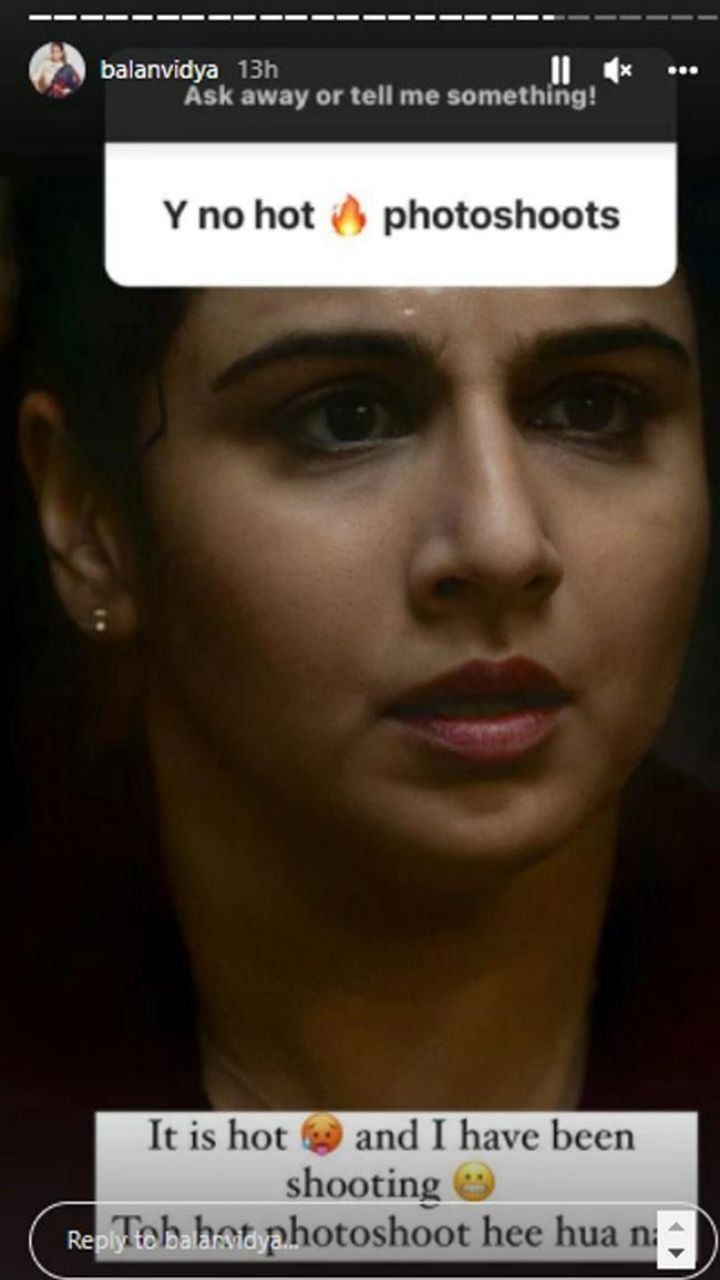 यस क्रममा अभिनेत्रीले फ्यानहरूसँग अन्तरक्रिया गर्दा आफ्नो जवाफले फ्यानहरूलाई चकित पारिन् । एक प्रयोगकर्ताले विद्यालाई तपाइ किन हट फोटोशुट गर्नुहुन्न भनेर सोधेका थिए ।