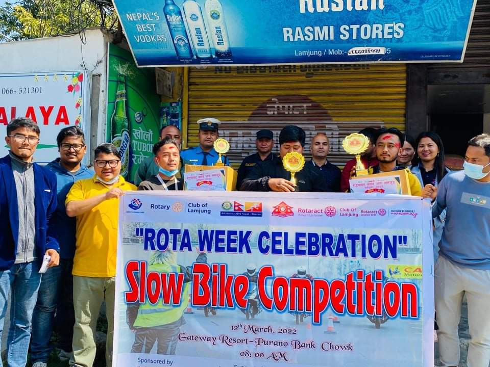 छिटो गए भन्न सकिन्न, बिस्तारै गए अवश्य पुगिन्छ’ भन्ने नाराका साथ रोटा सप्ताहको अवसर पारेर प्रतियोगिता सञ्चालन गरेको रोट्रयाक्ट क्लब अफ लमजुङका अध्यक्ष मुकेश कुँवरले बताए । प्रतियोगितामा रेशम भारती सबैभन्दा बिस्तारै निर्धारित दुरी पार गरी विजेता बन्न सफल भए । २८ जनाको सहभागिता रहेको प्रतियोगितामा अनुप श्रेष्ठ दोश्रो र सन्दीप लामा तेस्रो भए ।