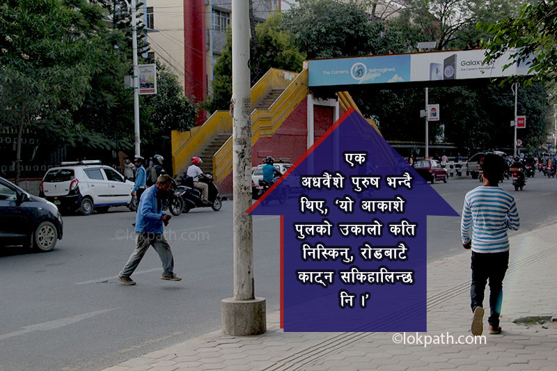 रत्नपार्कबाट बाटो काट्न लाइन लागेका एक अधवैंशे पुरुष भन्दै थिए, ‘यो आकाशे पुलको उकालो कति निस्किनु, यहीँबाट काट्न सकिहालिन्छ नि ।’