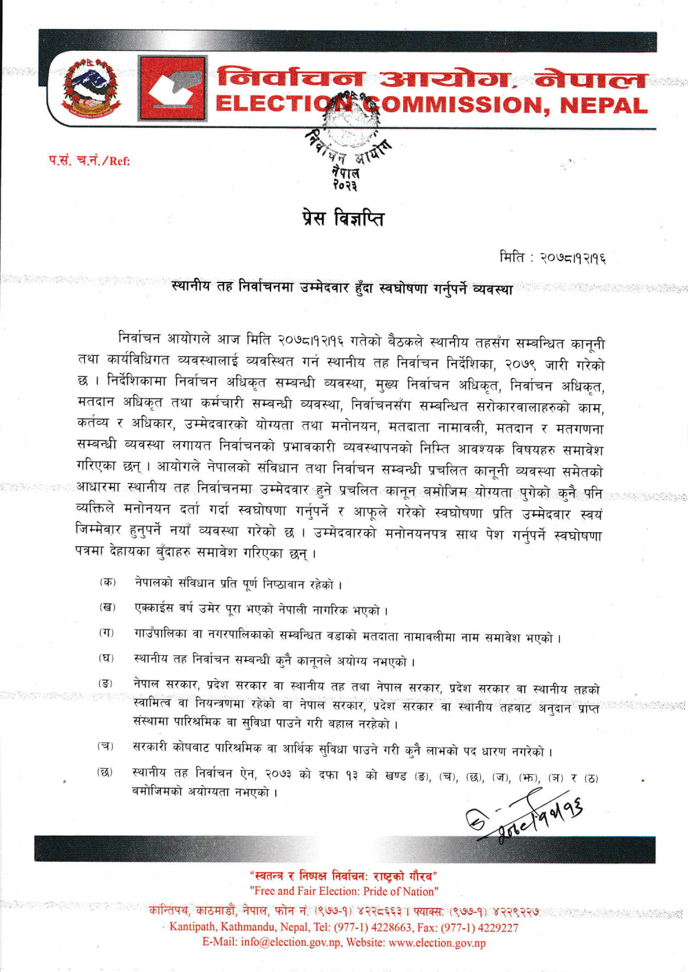 ‘स्थानीय तह निर्वाचनमा उम्मेदवार हुने प्रचलित कानून बमोजिम योग्यता पुगेका कुनै पनि व्यक्तिले मनोनयन दर्ता गर्दा स्वघोषणा गर्नुपर्ने र आफूले गरेको स्वघोषणा प्रति उम्मेदवार स्वंय जिम्मेवार हुनुपर्ने व्यवस्था गरेको छ ।’ जारी निर्देशिकामा भनिएको छ ।