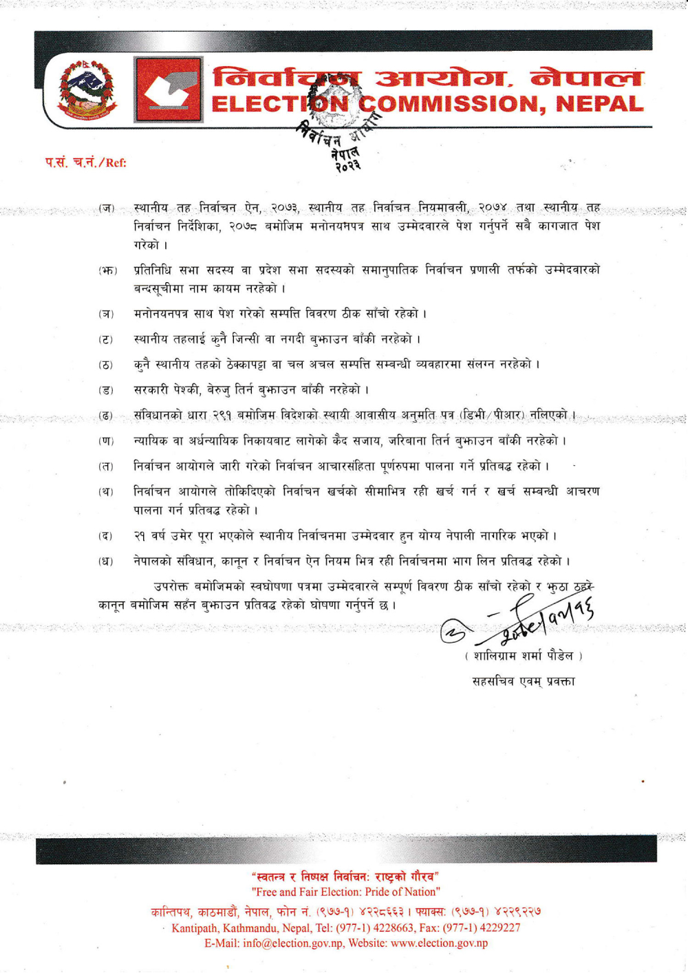 त्यसैगरी २१ वर्ष उमेर पुगेको कुनै पनि नेपाली नागरिकले मनोनयन दर्ता गर्दा १९ बुँदे स्वघोषणा गर्नुपर्ने प्रावधान समेत लागू गरिएको छ ।