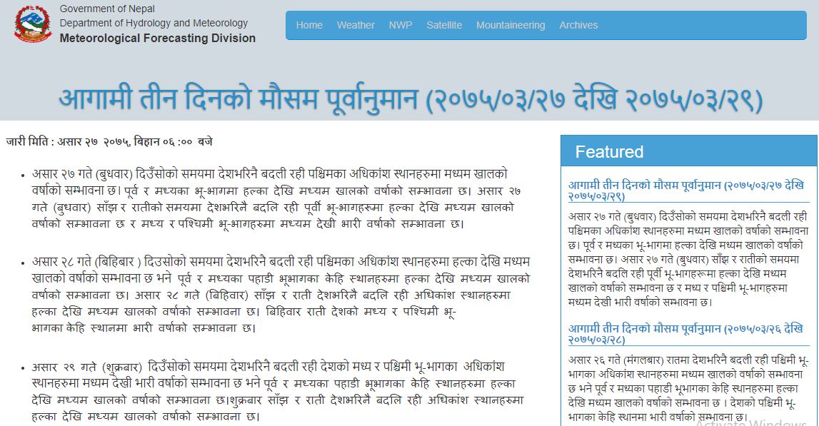 जल तथा माैसम पूर्वानुमान महाशाखाका अनुसार बिहिबार पनि देशभर मनसुन सक्रिय रहनेछ ।