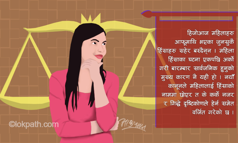 हिजोआज महिलाहरु आफूमाथि भएका जुनसुकै हिंसाहरु सहेर बस्दैनन् । बरु महिला हिंसाका घटना एकपछि अर्को गरी बारम्बार सार्वजनिक हुनुको मुख्य कारण नै यही हो । नयाँ कानूनले महिलालाई हिंसाको नाममा छोएर त के कर्के नजर र गिद्धे दृष्टिकोणले हेर्न समेत वर्जित गरेको छ ।