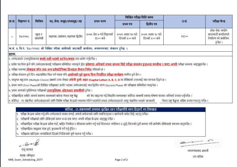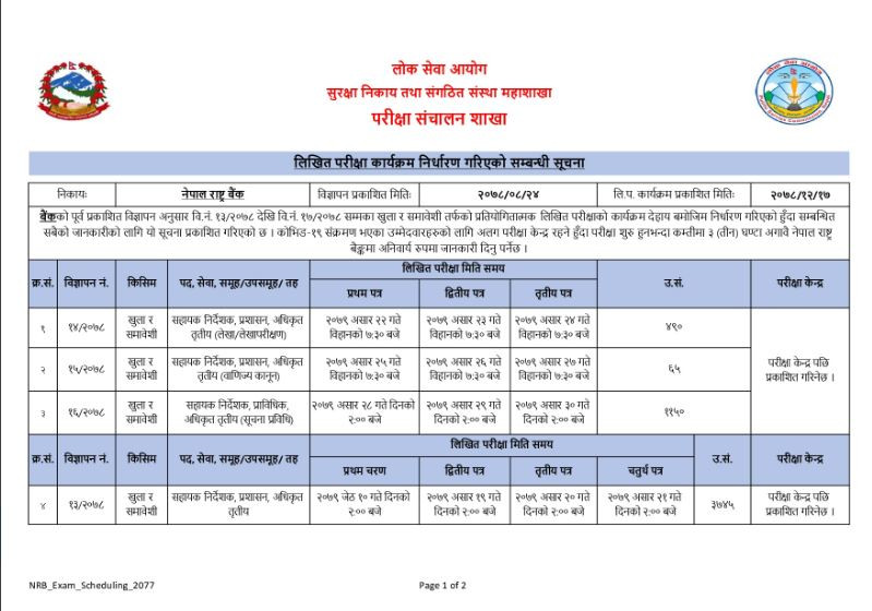 बैंकले पूर्व प्रकाशित विज्ञापन अनुसार वि.नं. १३र२०७८ देखि वि.नं. १७र२०७८ सम्मको लागि परीक्षा तालिका सार्वजनिक गरेको हो ।