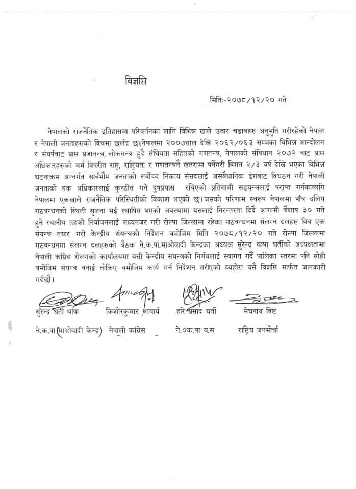 संविधान, संसद,राष्ट्र, राष्ट्रियता र गणतन्त्रमा विगत २÷३ वर्षदेखि प्रतिगामी संययद्यत्र भईरहेकाले त्यसलाई परास्त गर्न गठबन्धन बनाउनु परेको विज्ञप्तिमा उल्लेख छ। आगामी वैशाख ३० गते केन्द्रीय पाँच दलीय गठबन्धनलाई निरन्तरता दिने रोल्पा जिल्लाका नेताहरुले समझदारी गरेका छन्।